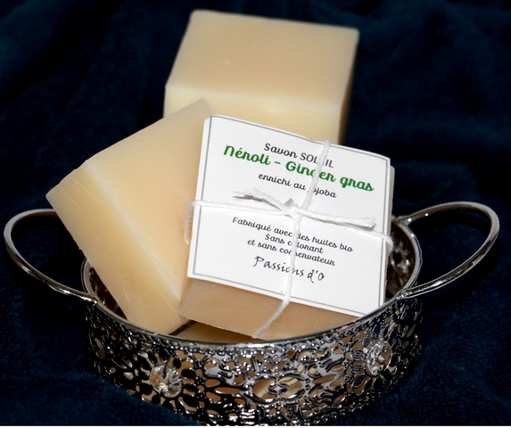 Un savon artisanal parfumé Passions d'O accompagné de son éponge dans son habit de fête.
